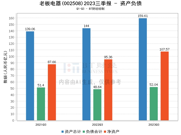 从资产负债方面看,老板电器2023年三季度末的总资产为159.61亿元,相比上年度末的150.4亿元增长了6.12%。负债合计52.04亿元,略高于上年度末的51.82亿元。公司的净资产为107.57亿元,较上年度末的98.58亿元增长了9.35%。资产负债率为32.6%,较上年度末的34.45%有所下降。这表明公司的财务状况稳健,资产负债结构良好。