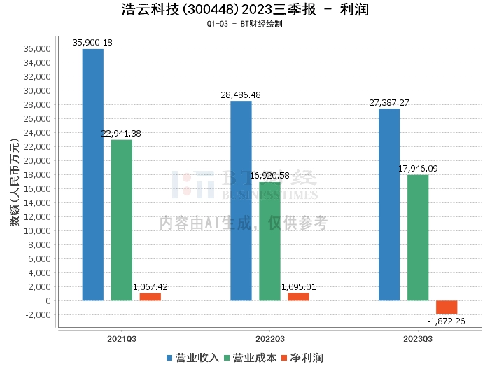 在利润方面,浩云科技2023年三季度的营业收入为2.74亿元,相比上年同期的2.85亿元减少了3.86%。营业利润为-1623.77万元,相比上年同期的977.05万元,公司由盈利转为亏损。净利润为-1872.26万元,相比上年同期的1095.01万元,同样由盈利转为亏损。这些数据的变化主要原因是公司的营业成本增加,以及应收账款及其他应收款坏账准备减少所致。