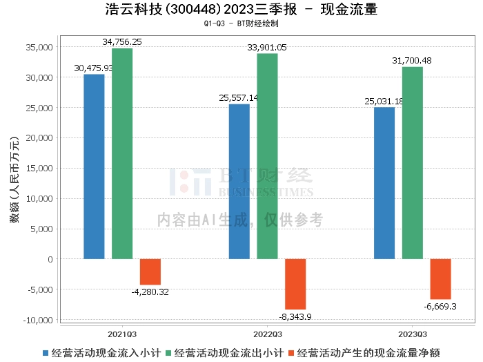 在现金流量方面,浩云科技2023年三季度的经营活动现金流入小计为2.5亿元,相比上年同期的2.56亿元减少了2.34%。经营活动现金流出小计为3.17亿元,相比上年同期的3.39亿元减少了6.49%。