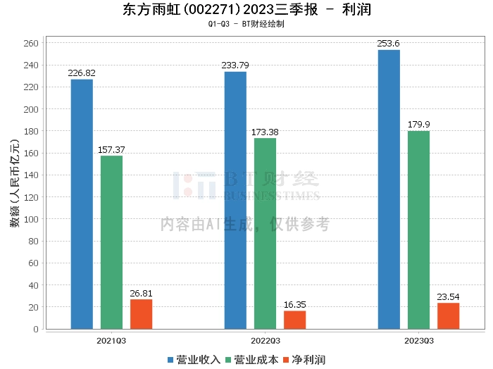 在利润方面,东方雨虹2023年三季度的营业收入为253.6亿元,相比上年同期的233.79亿元增加了19.81亿元,增长率为8.48%。营业利润为29.44亿元,相比上年同期的19.42亿元增加了10.02亿元,净利润为23.54亿元,相比上年同期的16.35亿元增加了7.19亿元,增长率为42.22%。这些数据显示出公司的盈利能力有所提升。