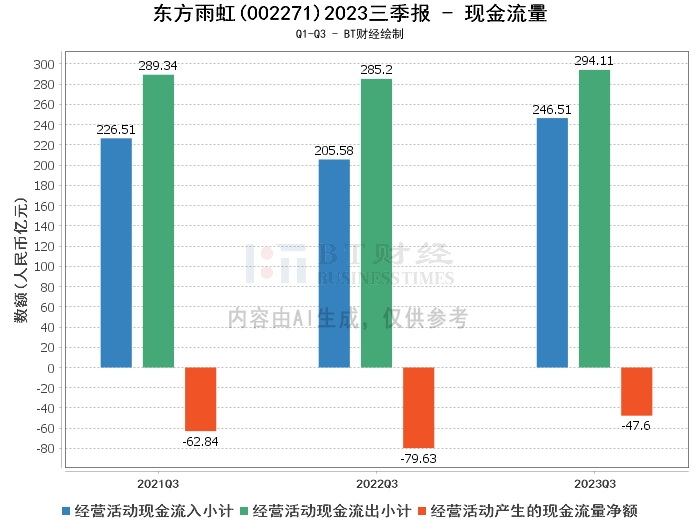 综上所述,东方雨虹2023年三季度的经营状况总体良好,盈利能力有所提升,负债管理效果显著,现金流状况改善。然而,公司还需要继续加强现金流管理,提高现金流入,减少现金流出,以保持良好的现金流状况。
