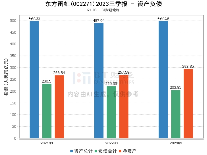 在资产负债方面,东方雨虹2023年三季度的总资产为497.19亿元,相比上年度末的505.56亿元有所下降。负债合计为203.85亿元,相比上年度末的233.67亿元减少了29.82亿元,资产负债率从46.22%下降到41%,显示出公司负债管理的效果。净资产为293.35亿元,相比上年度末的271.88亿元增加了21.47亿元,反映出公司净资产的增长。