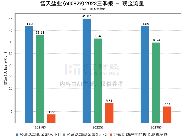 再次,从现金流量方面看,雪天盐业的经营活动产生的现金流量净额为7.11亿元,相比上年同期的8.61亿元有所下滑。经营活动现金流入小计为41.85亿元,相比上年同期的45.07亿元有所下滑。经营活动现金流出小计为34.74亿元,相比上年同期的36.46亿元有所下降。这表明公司的现金流量状况良好,公司的经营活动能够持续产生稳定的现金流入。