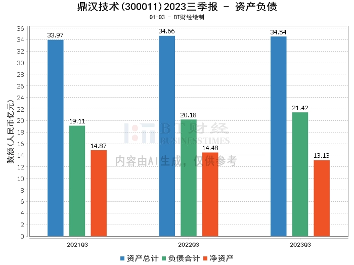 在资产负债方面,鼎汉技术2023年三季度的总资产为34.54亿元,相比上年度末的34.4亿元略有增长。负债总额为21.42亿元,相比上年度末的21.34亿元也略有增长。净资产为13.13亿元,相比上年度末的13.06亿元略有增长。资产负债率为61.99%,相比上年度末的62.04%略有下降。这表明公司的资产负债结构总体稳定。