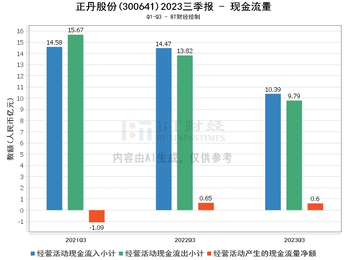 在现金流量方面,公司2023年三季度的经营活动产生的现金流量净额为5996.3万元,较上年同期的6505.24万元略有下降。经营活动现金流入小计为10.39亿元,较上年同期的14.47亿元有所减少。经营活动现金流出小计为9.79亿元,较上年同期的13.82亿元有所减少。这可能是由于公司的营业活动有所减少,导致现金流量的变动。