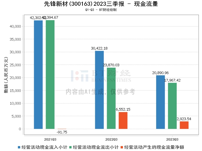 在现金流量方面,先锋新材的经营活动产生的现金流量净额在年初至本报告期末为2923.54万元,较上年同期的6552.15万元大幅减少。经营活动现金流入小计在年初至本报告期末为2.09亿元,较上年同期的3.04亿元有所减少。经营活动现金流出小计在年初至本报告期末为1.8亿元,较上年同期的2.39亿元有所减少。这些变化主要是由于公司在报告期内支付上年度职工薪酬,以及已背书未终止确认应收票据减少等因素影响。