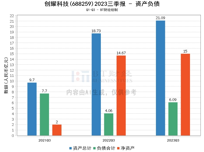 从资产负债方面来看,创耀科技2023年三季度末的总资产为21.09亿元,相比上年度末的21.99亿元有所减少。负债合计为6.09亿元,较上年度末的7.12亿元有所下降。净资产为15亿元,略高于上年度末的14.87亿元。资产负债率为28.89%,较上年度末的32.39%有所下降。