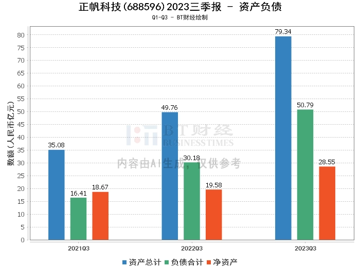 在资产负债方面,正帆科技2023年三季度末的总资产为79.34亿元,相比上年度末的59.54亿元增长了33.25%。负债合计为50.79亿元,相比上年度末的35.41亿元有所增长。净资产为28.55亿元,较上年度末的24.13亿元有所提升。资产负债率为64.02%,相比上年度末的59.47%有所上升。