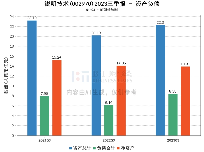在资产负债方面,锐明技术2023年三季度的总资产为22.3亿元,相比上年度末的20.05亿元有所增长。负债合计为8.38亿元,相比上年度末的6.43亿元有所增加。净资产为13.91亿元,相比上年度末的13.62亿元略有增长。资产负债率为37.6%,相比上年度末的32.08%有所上升。这些变化主要是因为新增银行借款及回款增加,以及长期应收款回款增加等因素。