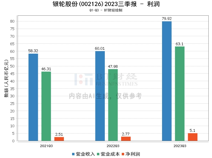 在利润方面,银轮股份2023年三季度的营业收入为79.92亿元,相比上年同期的60.01亿元增长了33.19%。营业利润为5.88亿元,相比上年同期的3.15亿元增长了86.67%。净利润为5.1亿元,相比上年同期的2.77亿元增长了84.12%。这些变化主要系乘用车板块新项目、新客户订单增加、营业收入增加、当期应交增值税增加引起教育费及城建税增加、公司不断加大研发投入、银行贷款利息支出及受汇率变动影响,本期汇兑收益较上期减少、本期取得与收益相关的政府补助减少、理财收益较上期减少及应收票据贴现费用增加、其他非流动金融资产公允价值变动、上期处置非流动资产收益较大、捐赠支出增加、公司利润增加等因素所致。