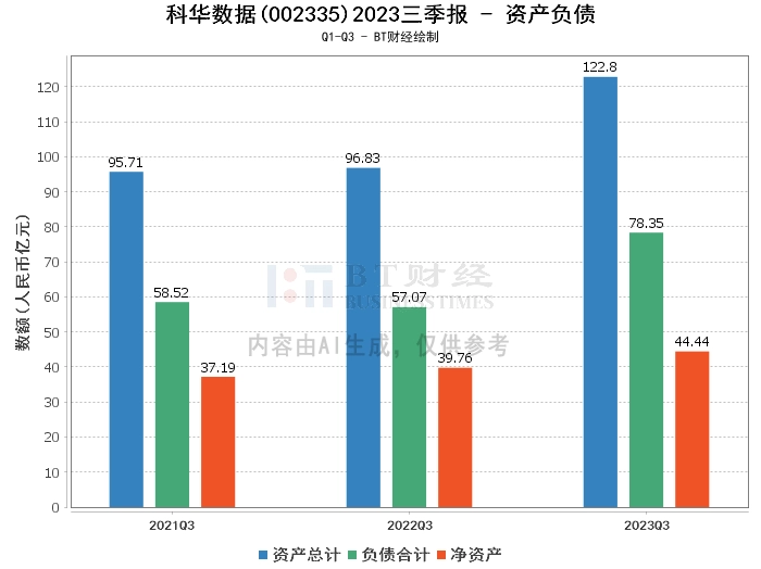 在资产负债方面,科华数据2023年三季度的总资产为122.8亿元,相比上年度末的100.14亿元有所增长。负债合计为78.35亿元,较上年度末的60.99亿元有所上升。公司的净资产为44.44亿元,相比上年度末的39.15亿元有所提升。资产负债率为63.81%,相比上年度末的60.9%略有上升。