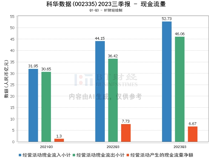 在现金流量方面,科华数据2023年三季度的经营活动产生的现金流量净额为6.67亿元,相比上年同期的7.73亿元有所下滑。经营活动现金流入小计为52.73亿元,较上年同期的44.15亿元有所增长。经营活动现金流出小计为46.06亿元,较上年同期的36.42亿元有所增加。