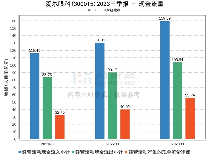在现金流量方面,爱尔眼科2023年三季度的经营活动产生的现金流量净额为55.74亿元,相比上年同期的40.02亿元增长了39.28%。经营活动现金流入小计为159.59亿元,相比上年同期的130.15亿元增长了22.61%。经营活动现金流出小计为103.84亿元,相比上年同期的90.12亿元增长了15.22%。这些数据显示,公司的现金流量状况良好,经营活动产生的现金流量净额的增长反映出公司的经营活动效益提升。