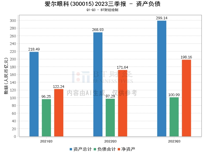 从资产负债方面看,爱尔眼科2023年三季度的总资产为299.14亿元,相比上年度末的265.79亿元增长了12.55%。负债合计为100.99亿元,相比上年度末的89.63亿元增长了12.67%。净资产为198.16亿元,相比上年度末的176.15亿元增长了12.51%。资产负债率为33.76%,与上年度末的33.72%基本持平。这些数据显示,公司的资产规模在稳步扩大,负债水平也在可控范围内。