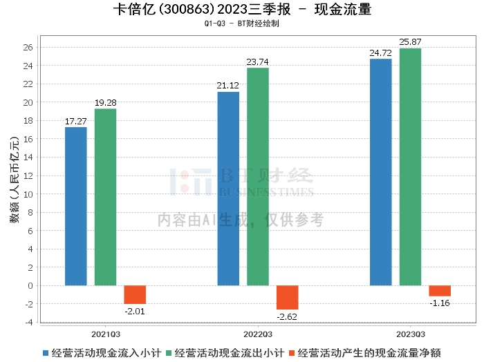 综上所述,卡倍亿公司在2023年三季度的经营状况总体良好,总资产、净资产增长显著,营业收入和净利润稳步上升,现金流状况也有所改善。然而,投资者在进行投资决策时,还需结合公司的行业地位、市场竞争状况、政策环境等多方面因素进行综合考虑。