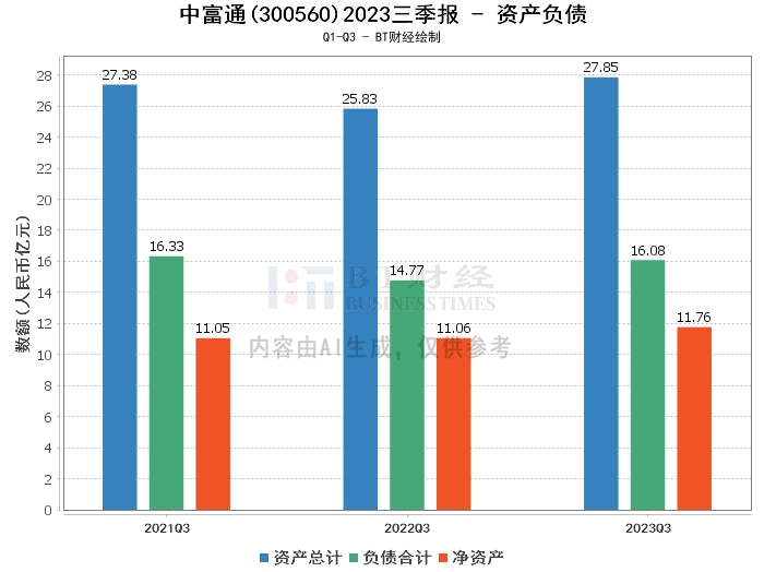 在资产负债方面,中富通2023年三季度末的总资产为27.85亿元,相比上年度末的27.1亿元有所增长。负债总额为16.08亿元,略高于上年度末的15.69亿元。净资产为11.76亿元,较上年度末的11.41亿元有所提升。资产负债率为57.75%,与上年度末的57.89%相比略有下降。这些数据显示,公司的资产规模在稳步增长,负债压力相对稳定,整体财务状况良好。