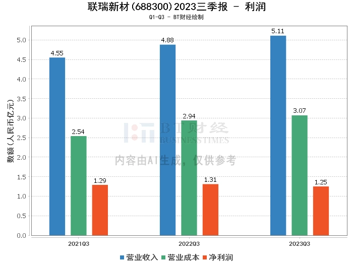 在利润方面,联瑞新材2023年三季度的营业收入为5.11亿元,相比上年同期的4.88亿元,增长了4.72%。营业利润为1.39亿元,相比上年同期的1.49亿元有所减少。营业成本为3.07亿元,相比上年同期的2.94亿元有所增加。净利润为1.25亿元,相比上年同期的1.31亿元,减少了4.90%。毛利率为39.93%,相比上年同期的39.74%有所增加。净利率为24.44%,相比上年同期的26.91%,有所下降。净资产收益率(ROE)为9.88%,相比上年度末的11.58%,有所下降。