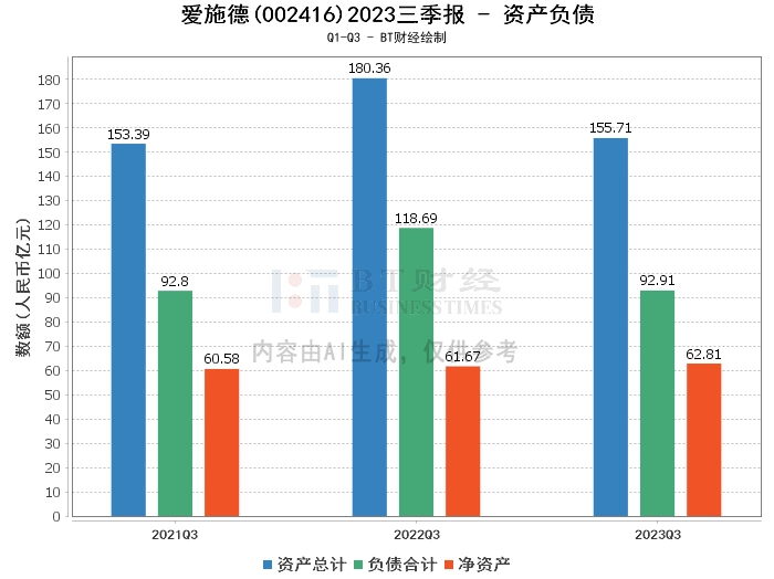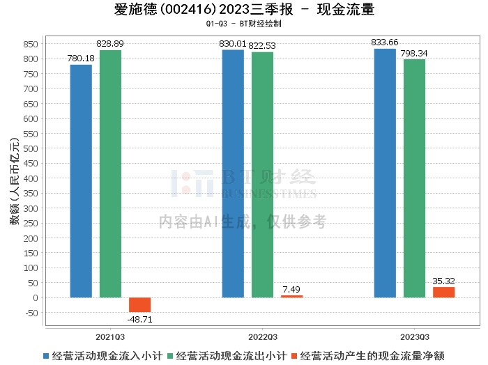 综上所述,爱施德公司在2023年三季度的经营状况总体稳定,资产总计和营业收入都有所增长,现金流量净额大幅度增加,但净资产和净利润有所下降,这可能是由于公司在扩大经营规模和提升业务能力的过程中,增加了负债和营业成本。从财务数据来看,公司的经营活动产生的现金流量净额大幅度增长,这对于公司的运营和发展都是有利的。