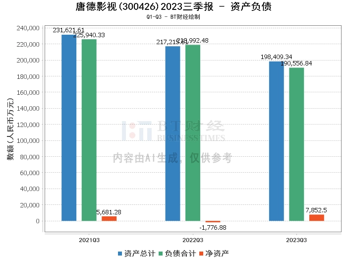 从资产负债方面来看,截至2023年三季度末,唐德影视的总资产为19.84亿元,相较于上年度末的20.4亿元,有所下降。负债合计为19.06亿元,较上年度末的19.62亿元也有所减少。公司的净资产为7852.5万元,较上年度末的7792.7万元略有增长。资产负债率为96.04%,较上年度末的96.18%有所下降。这表明公司的负债压力有所缓解,资产结构有所优化。