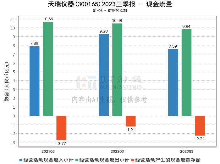 在现金流量方面,天瑞仪器2023年三季度的经营活动产生的现金流量净额为-2.24亿元,较上年同期的现金流量净额有所下降。经营活动现金流入小计为7.59亿元,较上年同期的9.28亿元有所减少。经营活动现金流出小计为9.84亿元,较上年同期的10.48亿元有所减少。
