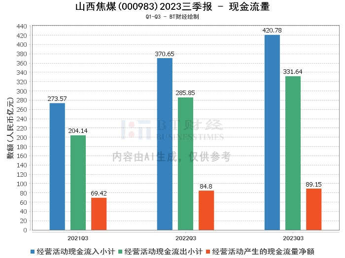 在现金流量方面,山西焦煤2023年三季度的经营活动产生的现金流量净额为89.15亿元,较上年同期的120.01亿元有所下降。经营活动现金流入小计为420.78亿元,较上年同期的494.79亿元减少了73.01亿元。经营活动现金流出小计为331.64亿元,较上年同期的374.78亿元减少了43.14亿元。这表明公司的现金流状况在下降,但现金流出的减少有助于公司的现金流管理。