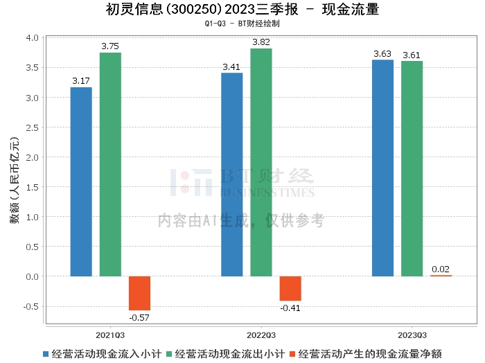再次,从现金流量方面来看,初灵信息2023年三季度经营活动产生的现金流量净额为211.4万元,较上年同期的-4130.32万元有大幅度提升。经营活动现金流入小计为3.63亿元,较上年同期的3.41亿元有所增长。经营活动现金流出小计为3.61亿元,较上年同期的3.82亿元有所减少。这些数据显示,公司的现金流状况得到了改善。