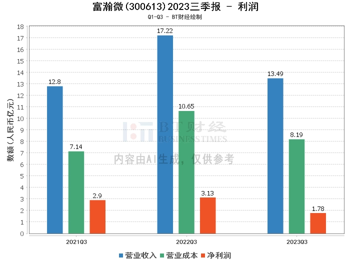 在利润方面,富瀚微2023年三季度的营业收入为13.49亿元,相比上年同期的17.22亿元,减少了21.63%。营业利润为1.79亿元,相比上年同期的3.43亿元,减少了47.81%。净利润为1.78亿元,相比上年同期的3.13亿元,减少了43.13%。这主要是由于全球地缘政治情况日趋复杂,经济发展放缓、通胀水平高企,半导体行业在下行周期已经运行近两年,下游需求受到冲击后恢复缓慢,公司的销售额因此受到影响。