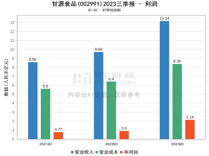 在利润方面,甘源食品2023年三季度的营业收入为13.14亿元,相比上年同期的9.69亿元有所增长。营业成本为8.36亿元,相比上年同期的6.4亿元有所增长。营业利润为2.85亿元,相比上年同期的1.25亿元有所增长。净利润为2.14亿元,相比上年同期的8950.86万元大幅增长。这些数据显示,公司的营业收入和利润都在稳步增长,经营效益显著。