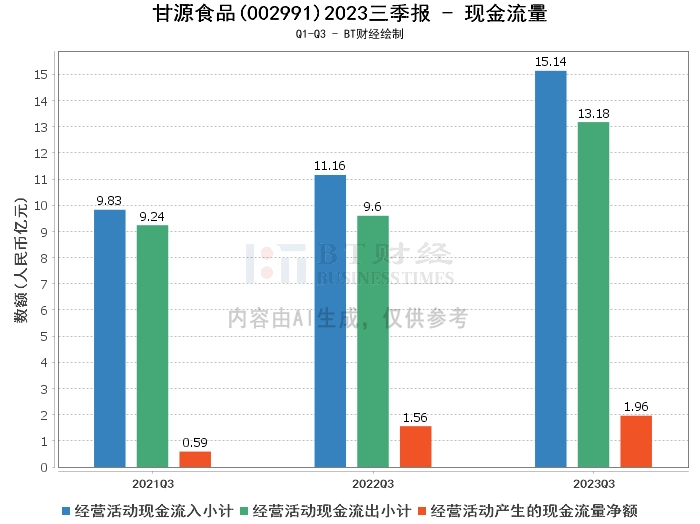 在现金流量方面,甘源食品2023年三季度的经营活动产生的现金流量净额为1.96亿元,相比上年同期的1.56亿元有所增长。经营活动现金流入小计为15.14亿元,相比上年同期的11.16亿元有所增长。经营活动现金流出小计为13.18亿元,相比上年同期的9.6亿元有所增长。这些数据显示,公司的经营活动产生的现金流量稳健,现金流入和流出都在稳步增长。