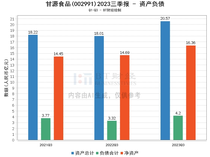 在资产负债方面,甘源食品2023年三季度的总资产为20.57亿元,相比上年度末的20.05亿元有所增长。负债合计为4.2亿元,相比上年度末的4.99亿元有所下降。净资产为16.36亿元,相比上年度末的15.06亿元有所增长。资产负债率为20.44%,相比上年度末的24.91%有所下降。这些数据显示,公司的资产规模在稳步增长,负债规模在逐步下降,整体财务状况良好。
