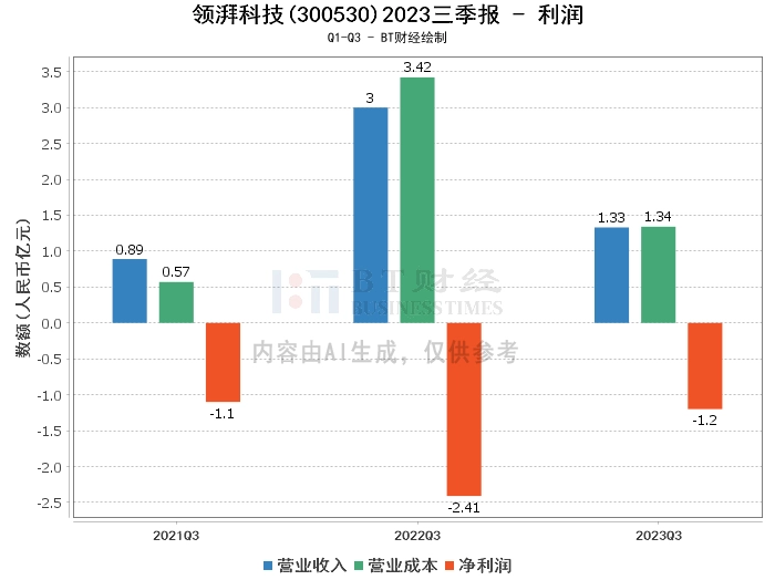 在利润方面,2023年1-9月,领湃科技的营业收入为1.33亿元,较上年同期的3亿元有所下降。营业成本为1.34亿元,较上年同期的3.42亿元有所下降。这主要是由于新能源电池市场行情需求疲软波动及化学业务缩减所致。