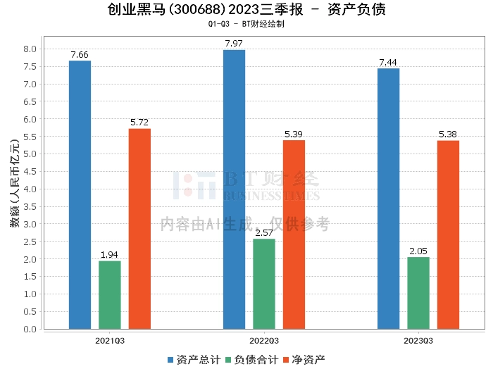 从2023年三季报的财务数据来看,创业黑马的总资产为7.44亿元,相比上年度末的8.01亿元,有所下降。负债合计为2.05亿元,相比上年度末的2.35亿元,也有所减少。净资产为5.38亿元,相比上年度末的5.66亿元,略有减少。资产负债率为27.6%,相比上年度末的29.33%,有所下降。这些数据显示,公司的整体财务状况在稳定中有所改善。