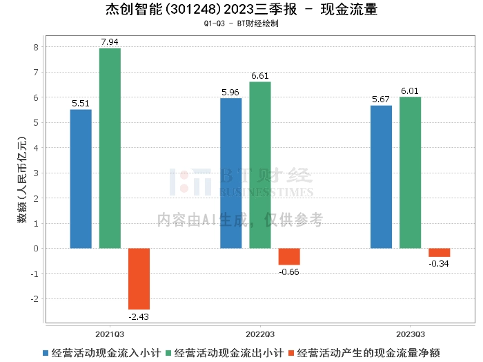 在现金流量方面,杰创智能2023年三季度的经营活动现金流入为5.67亿元,相比上年同期的5.96亿元有所下降。经营活动现金流出为6.01亿元,相比上年同期的6.61亿元有所减少。主要系公司加强经营活动资金流收支管