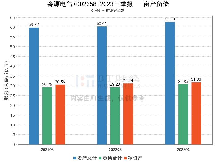 从资产负债方面来看,森源电气2023年三季度的总资产为62.68亿元,与上年度末的62.75亿元相比略有下降。负债总额为30.85亿元,较上年度末的31.79亿元有所减少。净资产为31.83亿元,较上年度末的30.95亿元有所增加。资产负债率为49.22%,较上年度末的50.67%有所下降。这些数据表明,公司的负债管理有所改善,净资产的增加也反映出公司的内在价值在提升。