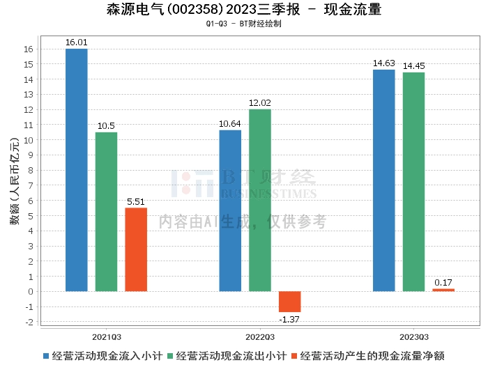 在现金流量方面,森源电气2023年三季度的经营活动产生的现金流量净额为1738.1万元,较上年同期的-1.37亿元有显著改善。经营活动现金流入小计为14.63亿元,较上年同期的10.64亿元有所增加。经营活动现金流出小计为14.45亿元,较上年同期的12.02亿元有所增长。这些数据表明,公司的现金流状况有所改善,经营活动的现金流入增加,有利于公司的日常运营。