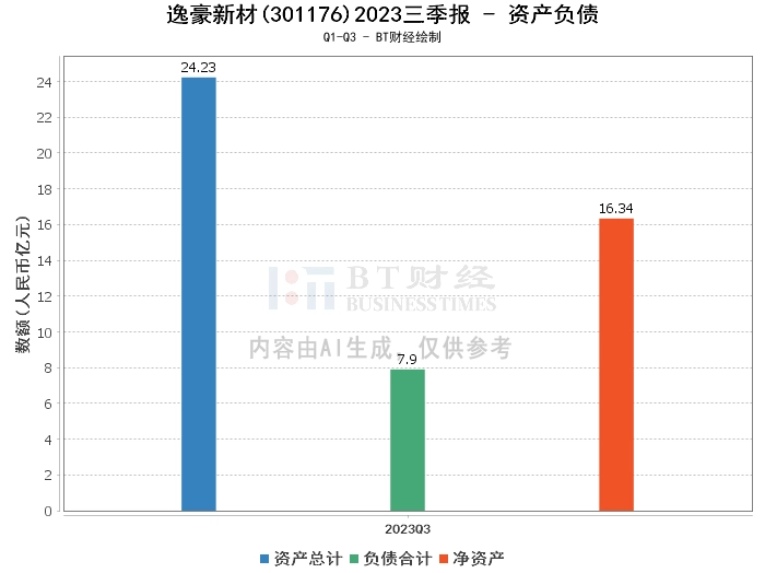 从资产负债方面看,逸豪新材2023年三季度末的总资产达到24.23亿元,相比上年度末的22.02亿元增长了10.03%。负债合计为7.9亿元,相比上年度末的5.35亿元增长了47.66%,资产负债率也从上年度末的24.29%上升至32.58%,这表明公司的负债水平有所上升。净资产为16.34亿元,相比上年度末的16.67亿元有所下降。