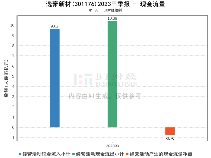 现金流量方面,逸豪新材2023年三季度经营活动产生的现金流量净额为-7606.54万元,相比上年同期的6094.98万元下降了224.80%。经营活动现金流入小计为9.62亿元,相比上年同期的8.59亿元增长了12.01%,而经营活动现金流出小计为10.38亿元,相比上年同期的7.98亿元增长了30.08%。这表明公司的现金流出增加,现金流入也有所增加,但是现金流量净额为负,说明公司的经营活动现金流量状况不佳。