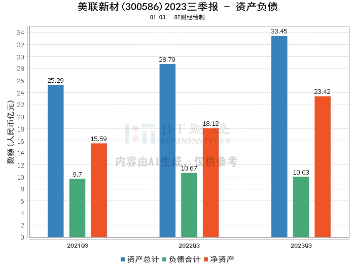 根据美联新材2023年三季报,公司的总资产为33.45亿元,相较于上年度末的30.11亿元有所增长。负债合计为10.03亿元,较上年度末的10.84亿元有所减少。净资产为23.42亿元,相比上年度末的19.27亿元有所提升。资产负债率为29.99%,较上年度末的36%有所下降。这表明公司的资产负债状况整体上有所改善,资产规模增大,负债规模减小,净资产增加,资产负债率下降,说明公司的偿债能力有所提高。