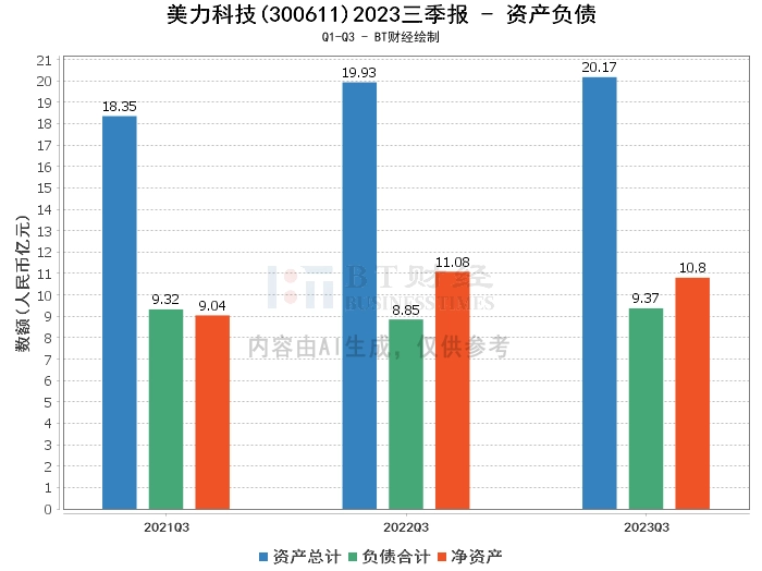首先,我们来看一下美力科技的资产负债状况。截至2023年三季度末,公司的总资产为20.17亿元,相比上年度末的19.69亿元有所增长。负债合计为9.37亿元,相比上年度末的8.94亿元也有所增加。净资产为10.8亿元,略高于上年度末的10.75亿元。资产负债率为46.46%,较上年度末的45.42%有所上升。这些数据表明,公司的资产规模在稳步增长,但同时负债也有所增加,需要关注公司的负债管理和偿债能力。