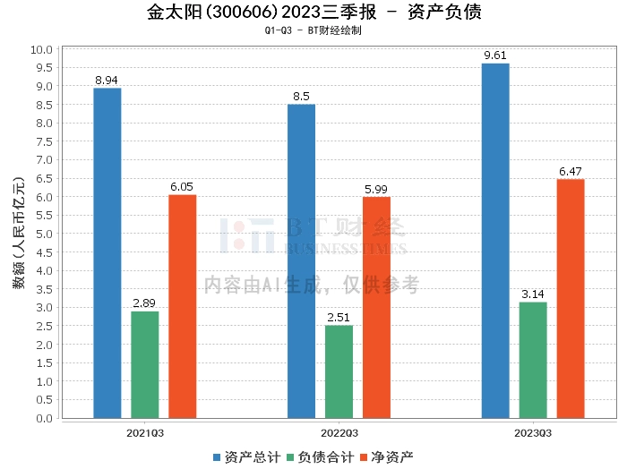 在资产负债方面,2023年三季度末,金太阳公司的总资产为9.61亿元,相比上年度末的8.34亿元增长了15.32%。负债合计为3.14亿元,相比上年度末的2.3亿元增长了36.52%。公司的净资产为6.47亿元,相比上年度末的6.04亿元增长了7.12%。资产负债率为32.7%,相比上年度末的27.57%有所上升。这些变化主要是由于购买固定资产和理财产品减少,以及预付工程款及设备款增加等因素导致的。