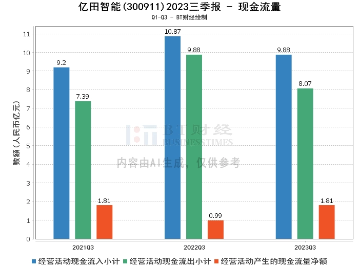 在现金流量方面,亿田智能2023年三季度的经营活动产生的现金流量净额为1.81亿元,相比上年同期的9944.74万元大幅增长。经营活动现金流入小计为9.88亿元,相比上年同期的10.87亿元有所减少。经营活动现金流出小计为8.07亿元,相比上年同期的9.88亿元有所减少。这表明公司的现金流量状况良好,经营活动产生的现金流量净额显著增加。