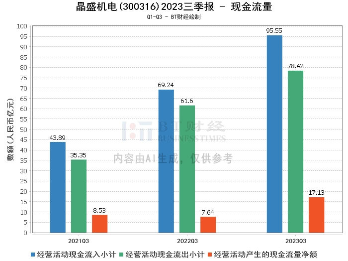 综上所述,晶盛机电在2023年三季度的经营状况良好,资产规模在扩大,负债规模有所增长但增长速度低于资产,净资产快速增长,资产负债率有所下降,显示出公司的财务结构在优化。公司的营业收入和利润都在快速增长,显示出公司的盈利能力在提高。公司的经营活动产生的现金流量在增加,现金流入增长速度超过了现金流出,显示出公司的现金流量状况在改善。