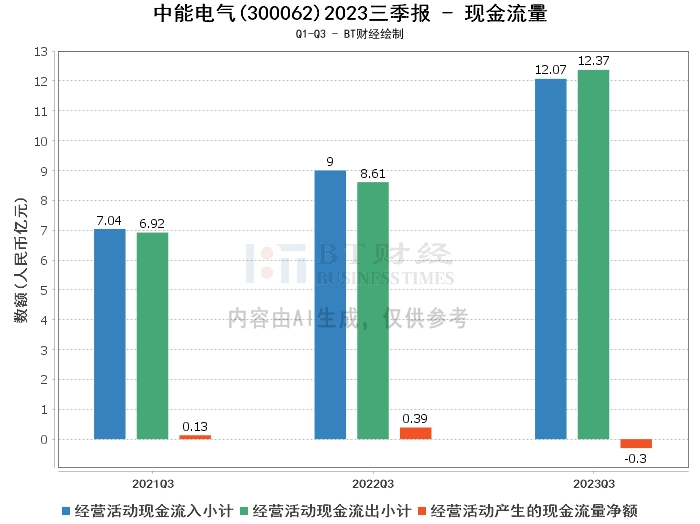 综上所述,中能电气股份有限公司2023年三季度的经营状况总体稳健。公司的资产负债结构正在优化,盈利能力在提高,但现金流量净额大幅下降,这可能会对公司的日常运营和长期发展产生一定影响。因此,投资者在考虑投资中能电气股份有限公司时,需要综合考虑公司的各项经营指标和市场环境,做出理性的投资决策。