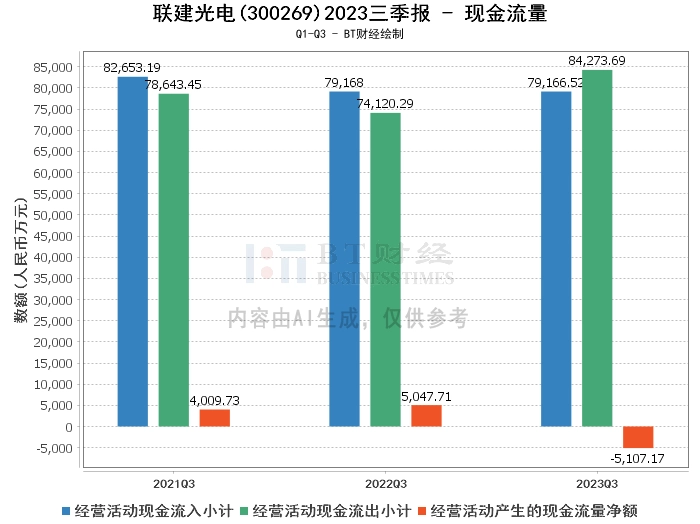 在现金流量方面,2023年三季度,联建光电的经营活动产生的现金流量净额为-5107.17万元,较上年同期的5047.71万元有所下降。经营活动现金流入小计为7.92亿元,与上年同期持平。经营活动现金流出小计为8.43亿元,较上年同期的7.41亿元有所增加。这表明公司的经营活动现金流出较多,需要进一步优化现金流管理。