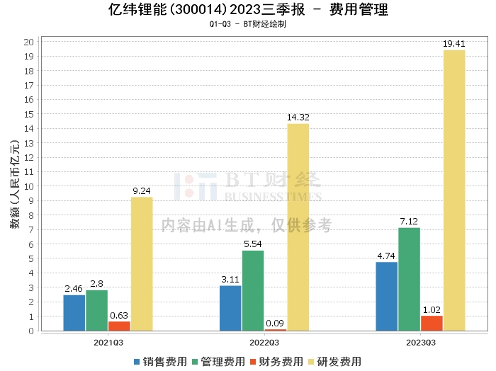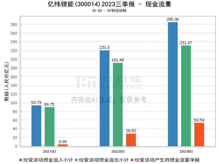 在现金流量方面,亿纬锂能2023年三季度经营活动产生的现金流量净额为53.59亿元,较上年同期的28.82亿元显著增长。经营活动现金流入小计为285.06亿元,较上年同期的220.3亿元有所增加。经营活动现金流出小计为231.47亿元,较上年同期的191.48亿元有所增加。