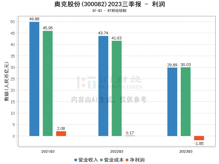 综上所述,奥克股份在2023年三季度的经营状况整体呈现下滑趋势。公司的总资产、负债总额、净资产均有所下降,营业收入、营业利润、净利润均出现下滑,现金流量净额也有所下滑。这些都表明公司在本报告期内的经营状况较上年同期有所下滑。