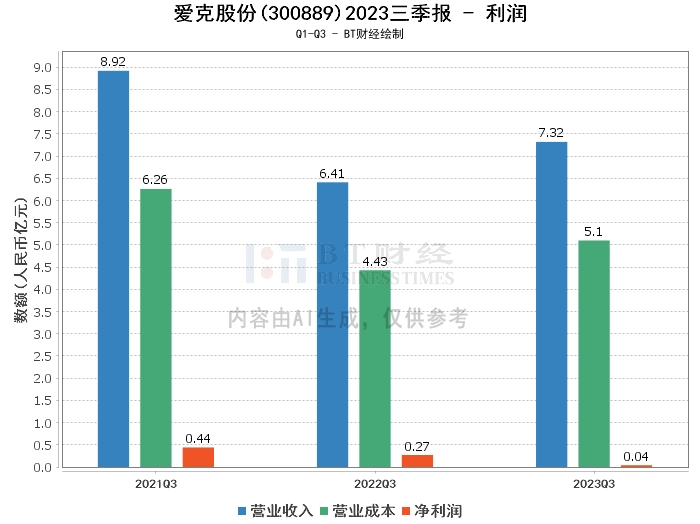 在利润方面,爱克股份2023年1-9月的营业收入为7.32亿元,相较于上年同期的6.41亿元,增长了14.13%。营业利润为109.22万元,相较于上年同期的2540.59万元,下降了95.70%。净利润为382.13万元,相较于上年同期的2727.77万元,下降了86.00%。这主要是由于公司应交增值税增加,对应的附加税增加,以及增加子公司,对应的期间费用增加等因素导致的。