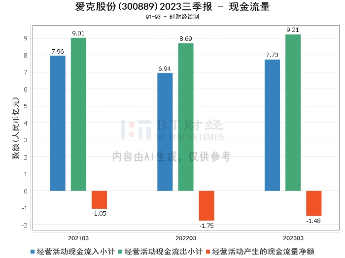 从现金流量方面来看,爱克股份2023年1-9月的经营活动现金流入小计为7.73亿元,相较于上年同期的6.94亿元,增长了11.38%。经营活动现金流出小计为9.21亿元,相较于上年同期的8.69亿元,增长了5.98%。经营活动产生的现金流量净额为-1.48亿元,相较于上年同期,增长了15.35%。
