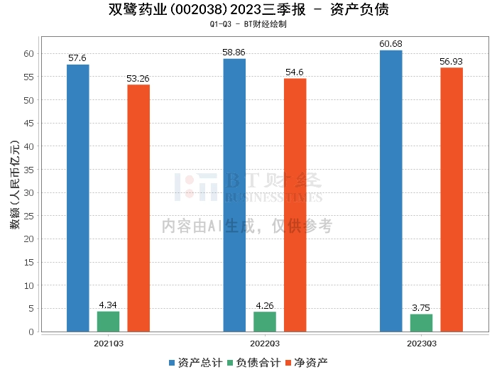 在资产负债方面,双鹭药业2023年三季度的资产总计为60.68亿元,相比上年度末的58.76亿元有所增长。负债合计为3.75亿元,相比上年度末的3.97亿元有所下降。净资产为56.93亿元,相比上年度末的54.79亿元有所增长。资产负债率为6.18%,相比上年度末的6.75%有所下降。