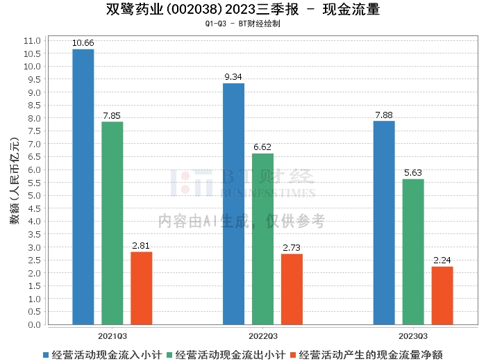在现金流量方面,双鹭药业2023年三季度的经营活动产生的现金流量净额为2.24亿元,相比上年同期的2.73亿元有所减少。经营活动现金流入小计为7.88亿元,相比上年同期的9.34亿元有所减少。经营活动现金流出小计为5.63亿元,相比上年同期的6.62亿元有所减少。